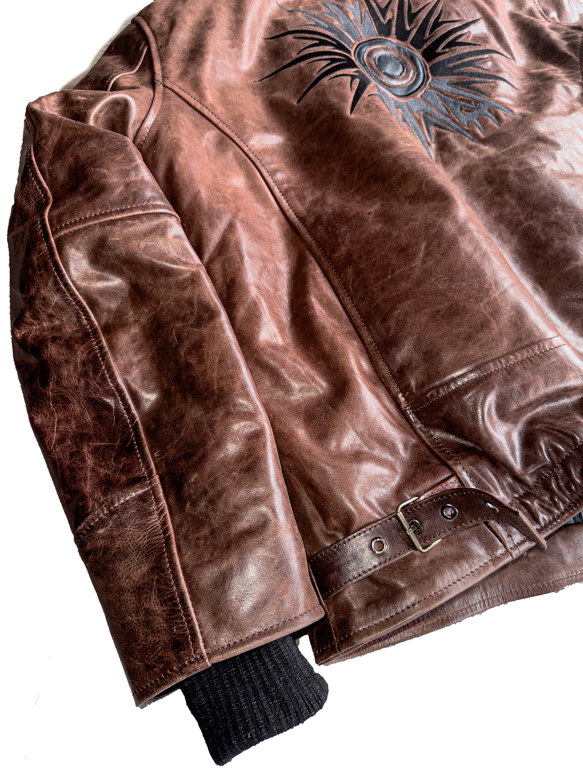 The jacket is handmade by a leather professional coming from Türkiye, and we polished it and giver her the details ourselves here in Northern France, to give her a worn and vintage look, the details all around the jacket is the result of dedication and patience in order to not damage it, and make it a timeless piece who can be related to an armor due to the thickness of the leather chosen with our Turkish partner.